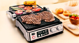 • Three-in-one cooking options: Use grill, open or oven mode for searing, barbecue-style grilling or gentle top-and-bottom cooking.