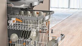 The improved 3D MultiFlex tray accommodates small items like espresso cups and large cutlery. With a sunken central section and adjustable side sections, it creates space for tall wine glasses and small crockery, offering unmatched flexibility and convenience.