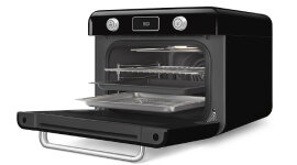 Features a polished black body, smoked glass door, and polished chrome accents, blending vintage aesthetics with modern craftsmanship. This countertop oven brings nostalgic style into contemporary kitchens without compromising on performance or functionality.